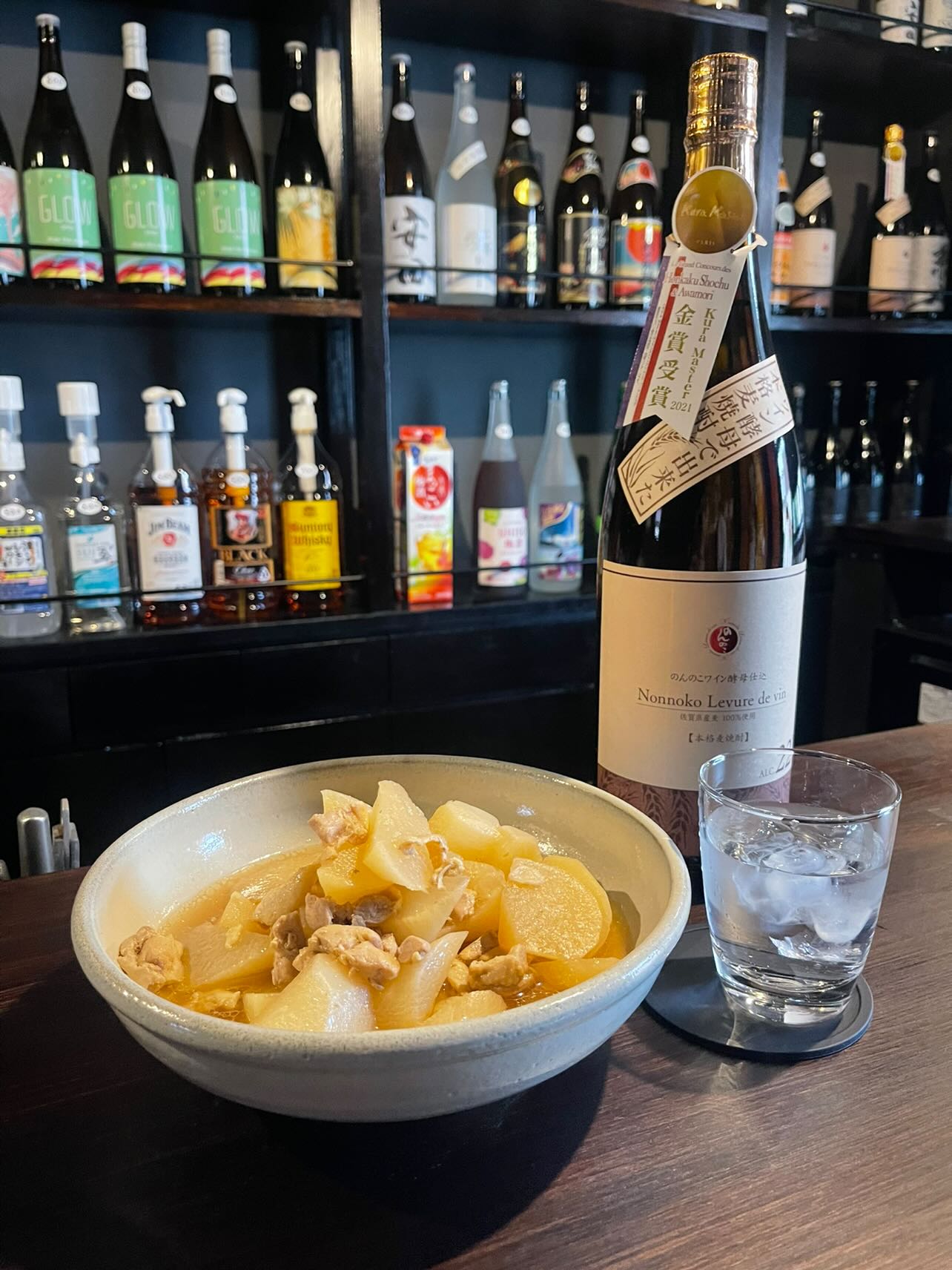 料理はカウンターに並ぶおばんざいが、税込300円。おつまみは税込100円~500円で用意されています。特におばんざいは家庭の味ということで人気が高いとのこと。お酒はビールや梅酒などもありますが、基本的には焼酎がメイン。壁には森さんが好きな焼酎がずらりと並んでおり、瓶に一杯あたりの金額が記載されています。一杯500円から飲むことができ、水割りでもお湯割りでもソーダ割でもロックでも、同じ銘柄なら全て同じ金額設定なのは嬉しいです。おつまみはポテトサラダや麻婆豆腐、玉子焼きや枝豆ぺペロン、ゆず大根やスナック類など、他にもいろいろ。個人的には〆の韓国ラーメンが気になりました。